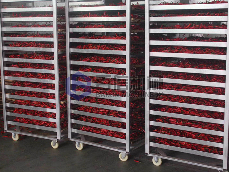 3、二次烘干階段:為保證成品辣椒干貨的品質(zhì),此階段需要辣椒鋪料均勻,堆放不可太厚,保證良好的透氣性,設(shè)置溫度在60~70℃,時長在6~8個小時即可。